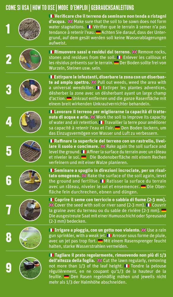 Composizione: Lolium perenne 25%, Poa pratensis 15%, Festuca ovina 35%, Festuca rubra commutata 25%